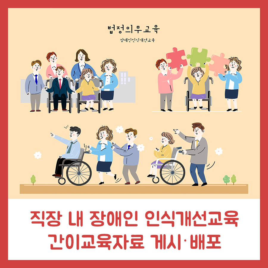 한국장애인고용공단에서 제공하는 직장 내 장애인 인식개선교육 자료를 첨부합니다. (50인 미만 사업장은 해당 자료 인쇄 후 직장 내 배포, 게시만으로도 교육 대체가 가능합니다.)