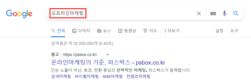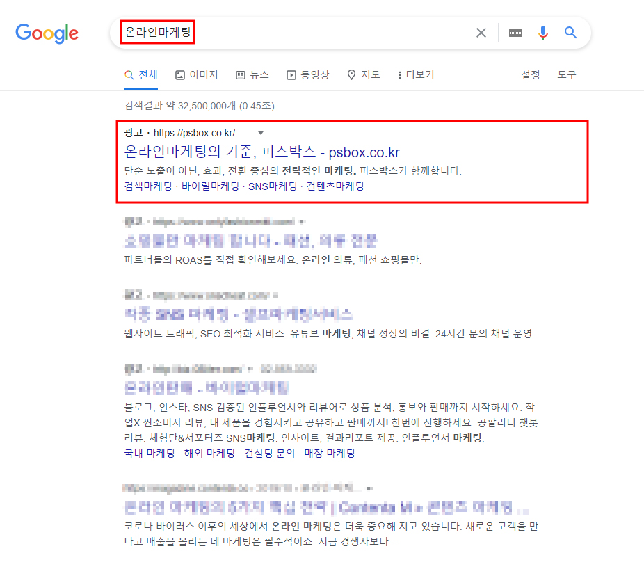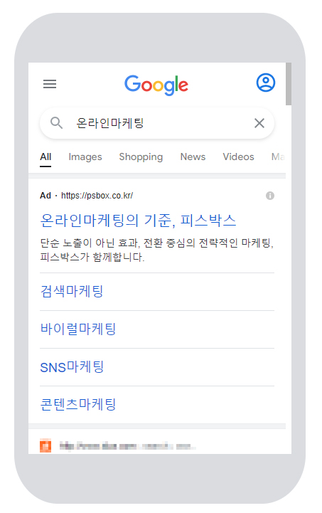 저희 피스박스는 '온라인마케팅' 회사로 광고주 확보를 위해' 온라인마케팅'이라는 키워드를 구매했습니다.