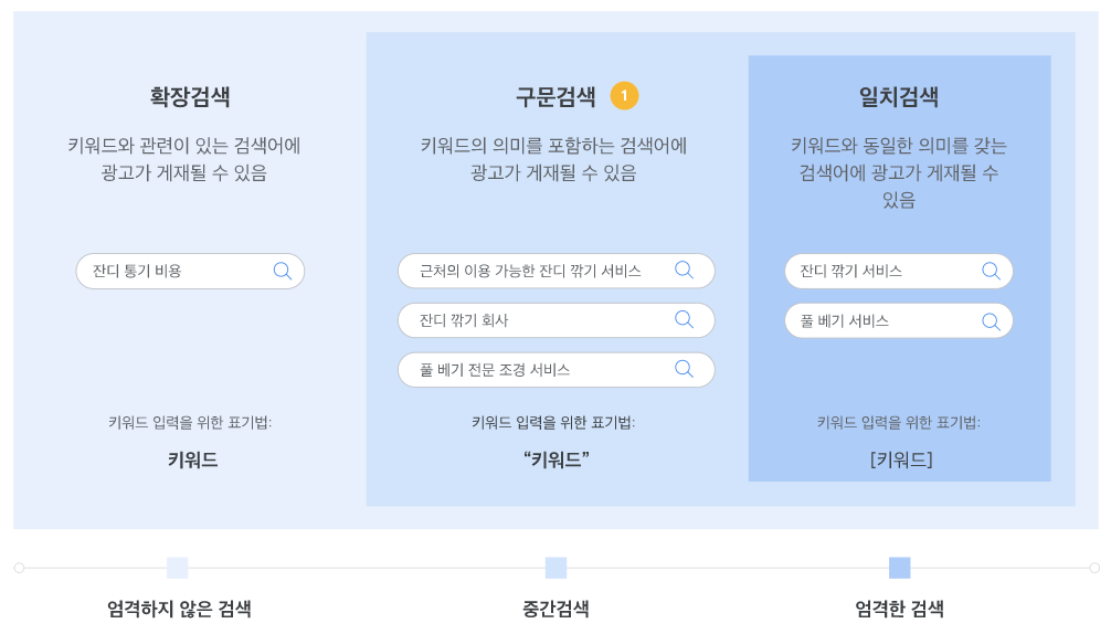 검색유형은 확장검색, 구문검색, 일치검색 세 가지로 구분하며, 구매한 키워드의 확장 여부를 선택할 수 있습니다. 굉장히 좋은 기능인 것 같지만 실제 광고를 집행해보면 그렇지 않습니다.