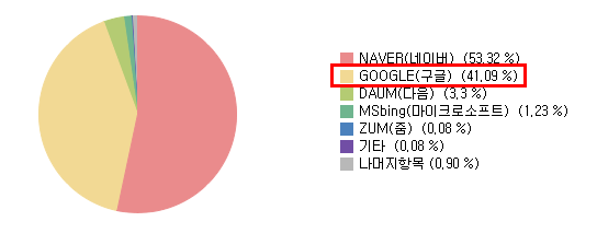 실제로 한 통계자료에 따르면, Google(구글)의 국내 포털 점유율이 2위이며 전체의 41.09%로 이제는 온라인광고를 할 때 놓치지 않아야 할 포털사이트로 자리를 잡아가고 있습니다.