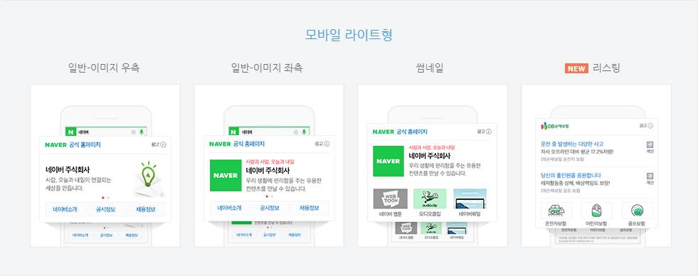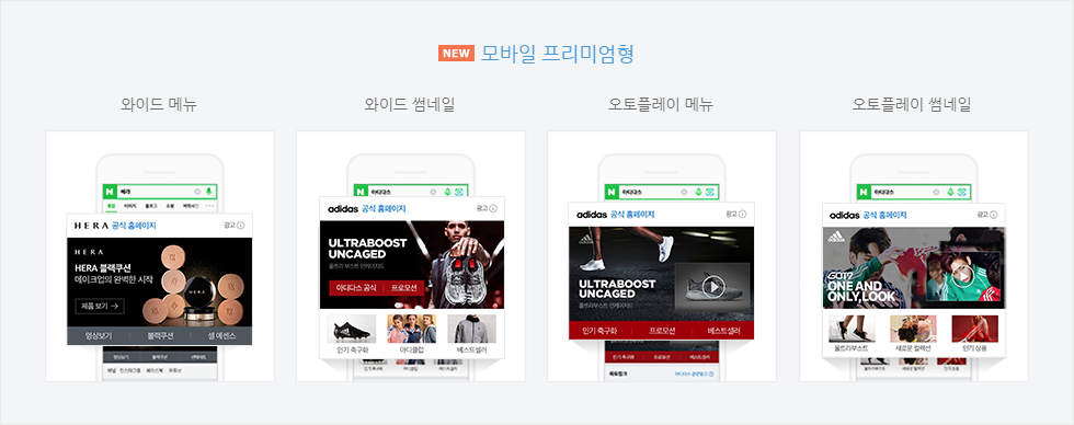 일반 웹사이트 영역, 파워링크 영역과는 달리 확연히 넓은 영역에서 이미지, 영상 등을 활용하여 브랜드 소개부터 랜딩페이지로 손쉽게 연결하는 링크 등을 설정할 수 있습니다.
