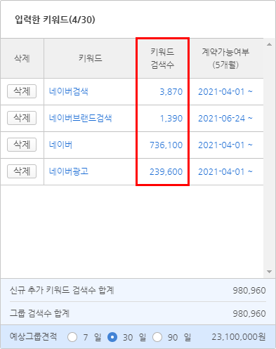 네이버 브랜드검색은 등록한 키워드들의 최근 30일간 월간 조회수를 합산하여 각 조회수 구간에 따라 비용이 크게 달라지기 때문에 브랜드 키워드 및 관련 브랜드 키워드 등록시 키워드 조회량을 분석하여 합리적인 단가를 구성해야 하고 현재 진행하고 있는 이벤트, 프로모션에 맞는 상품 유형을 선택해서 내용을 구성하는 것이 중요합니다.