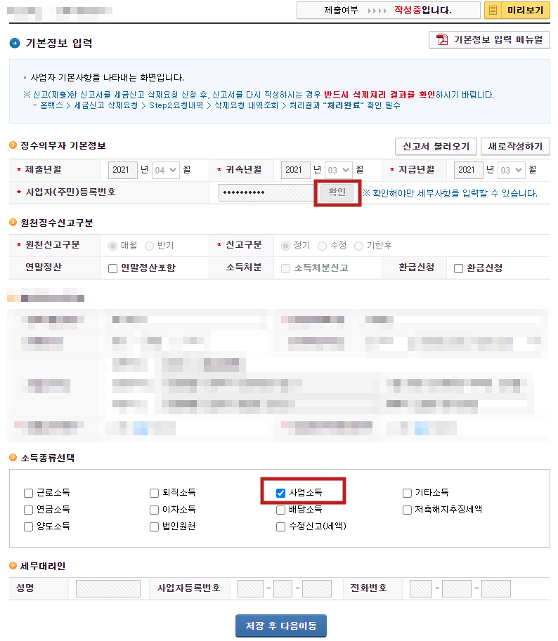 사업자(주민)등록번호 우측 '확인' 버튼을 누르면 하단에 원천징수의무자 입력란이 나옵니다.