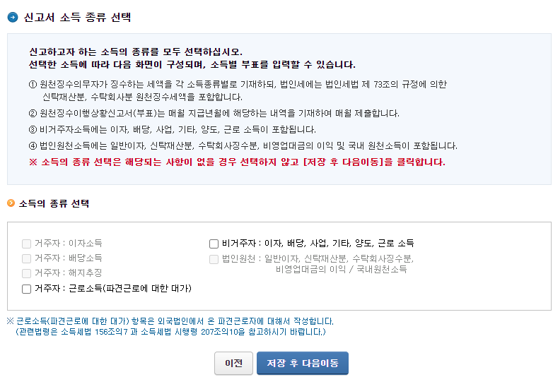 파견근로자거나 비거주자를 제외한 경우에는 해당 부분은 체크하지 않고 저장 후 다음으로 이동하시면 됩니다. 이후 신고서 부표 작성 화면에는 아무 것도 나오지 않는데 마찬가지로 신고서 작성 완료를 눌러주세요.