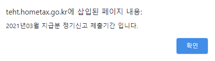 클릭하면 2021년 03월 지급분 정기신고 제출기간입니다. 라는 안내문구가 나오는데요.