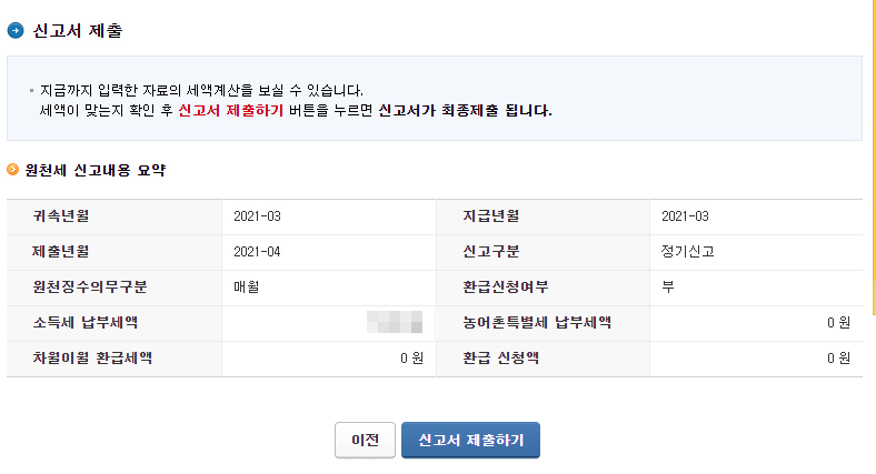 입력하신 세액이 맞는지 확인하고 신고서를 제출하기 버튼을 눌러주세요.