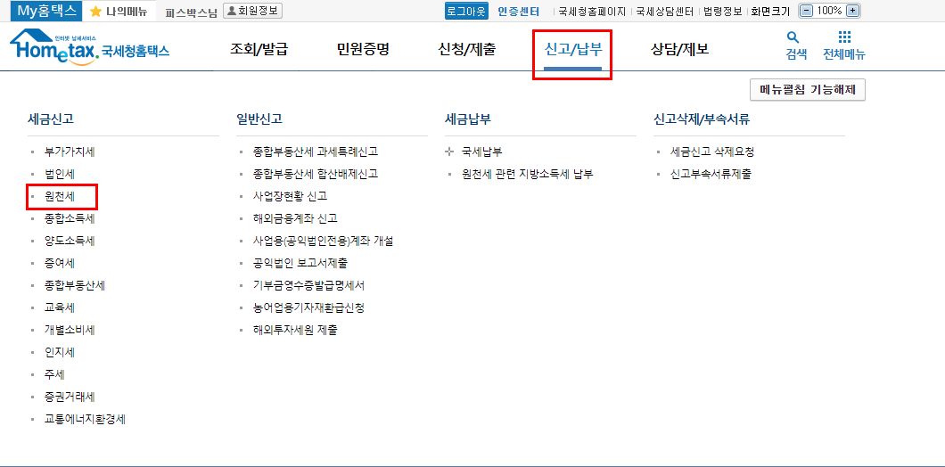 2) 상단 메뉴 신고/납부 - 세금신고 - 원천세 클릭